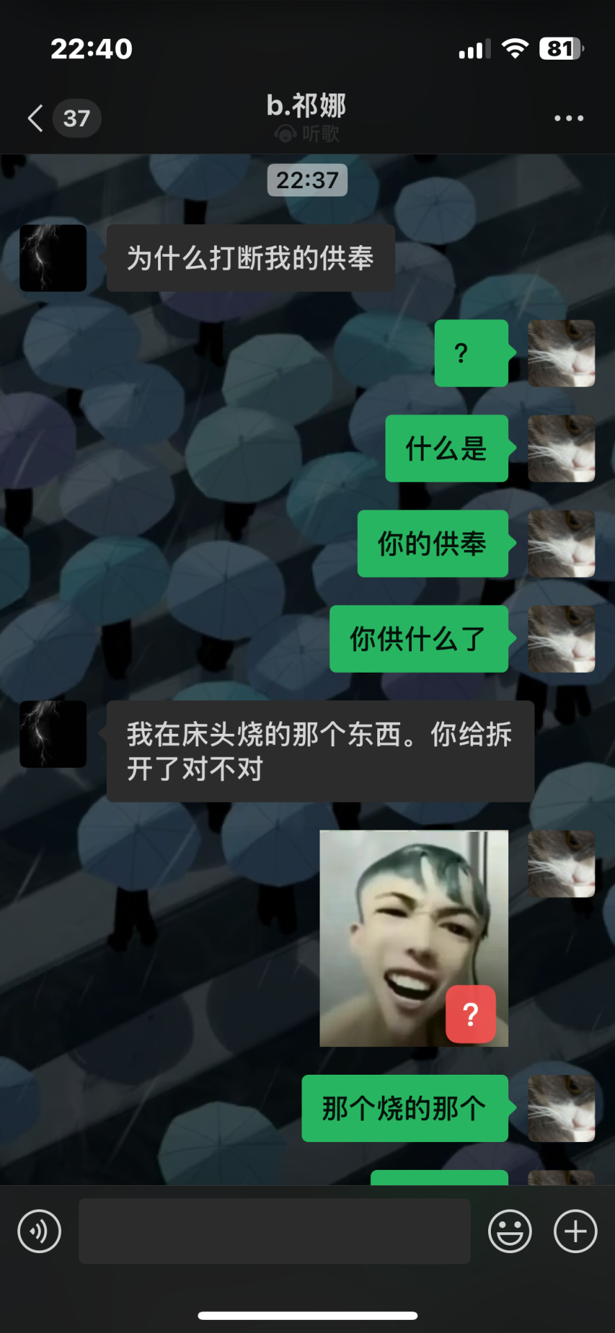 她早上把什么东西念念叨叨的卷成香的形状,咬破手指用血粘合。然后插在香炉里给烧了