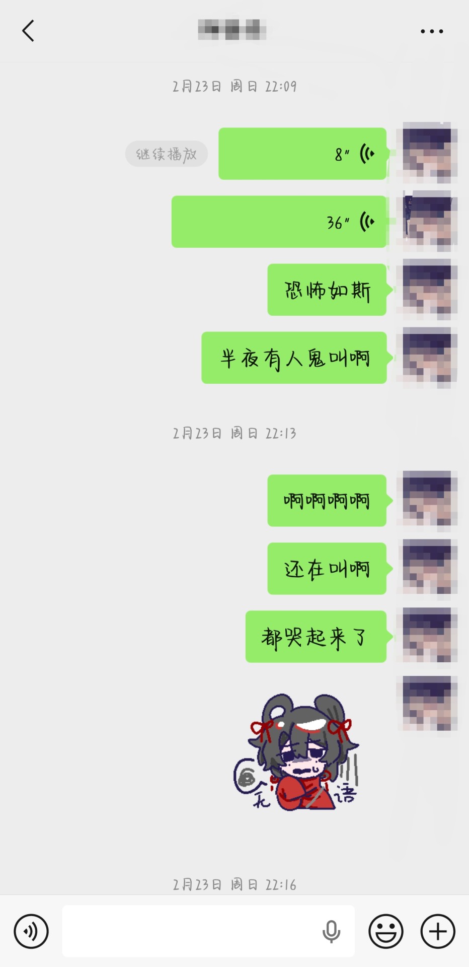 就在这后一天 轩轩家的黑猫刁了一个乌鸦的头放在了轩轩的床底下 居轩轩所说 是血肉模糊的 与此同时 我家外面有一个疯女人突然开始大叫 我不知道也不记得我们小区里有疯女人(这个我录下来了 大约是40秒的语音)这个女人叫了大约有五六分钟